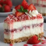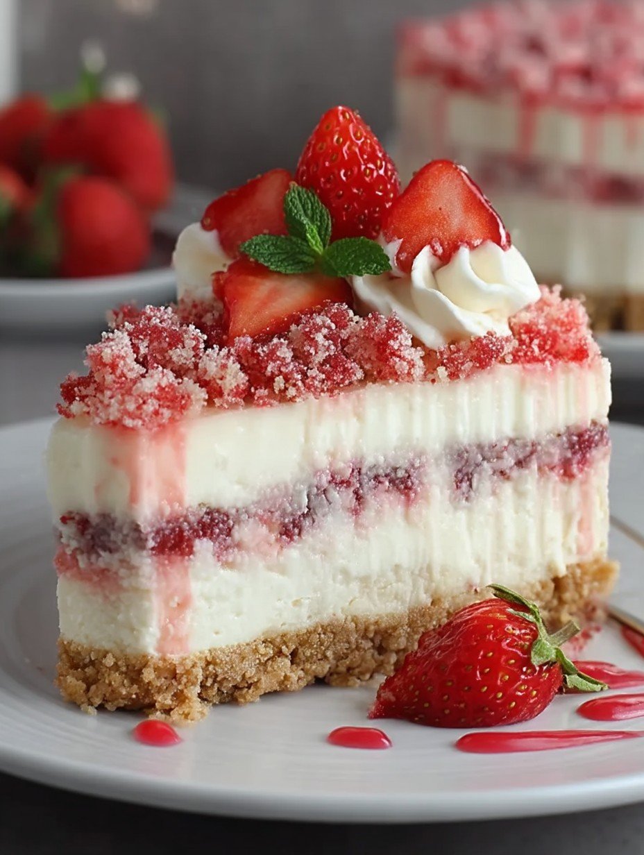 Leckeres erdbeer crunch käsekuchen Rezept mit detaillierten Anweisungen und Nährwertangaben.