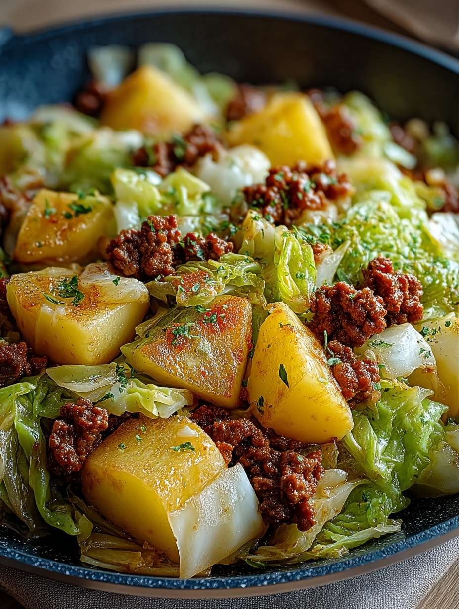 - Servieren Sie die Spitzkohl-Kartoffel-Pfanne heiß.