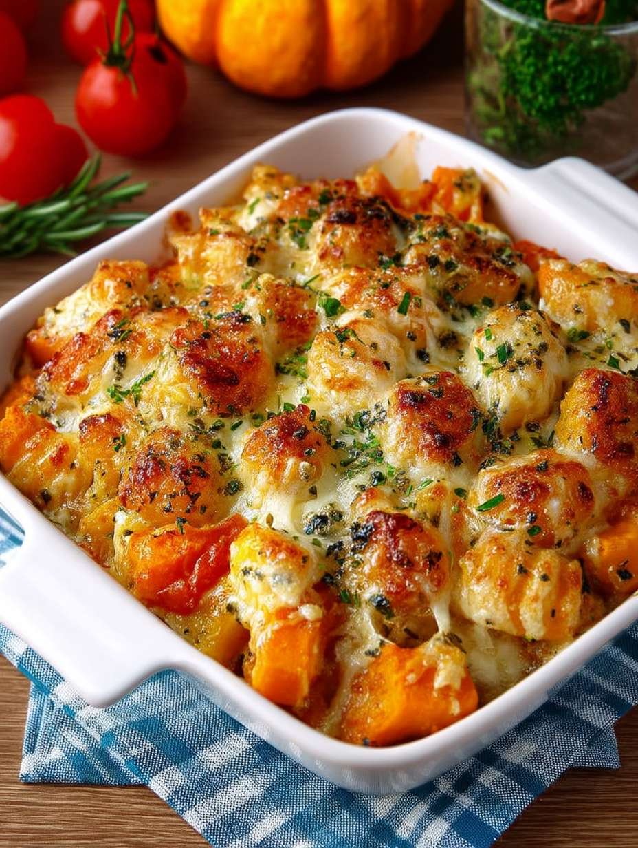 Der Gnocchi Kürbis Auflauf vereint einfache Zubereitung mit einem einzigartigen Geschmacksprofil, das sowohl herzhaft als auch süß ist. Die atemberaubende Optik des goldbraun gebackenen Auflaufs zieht alle Blicke auf sich und macht ihn zum perfekten Highlight bei jedem Essen. Außerdem lässt sich der Auflauf vielseitig anpassen – ob mit Hähnchen oder vegetarisch, hier sind der Kreativität keine Grenzen gesetzt.