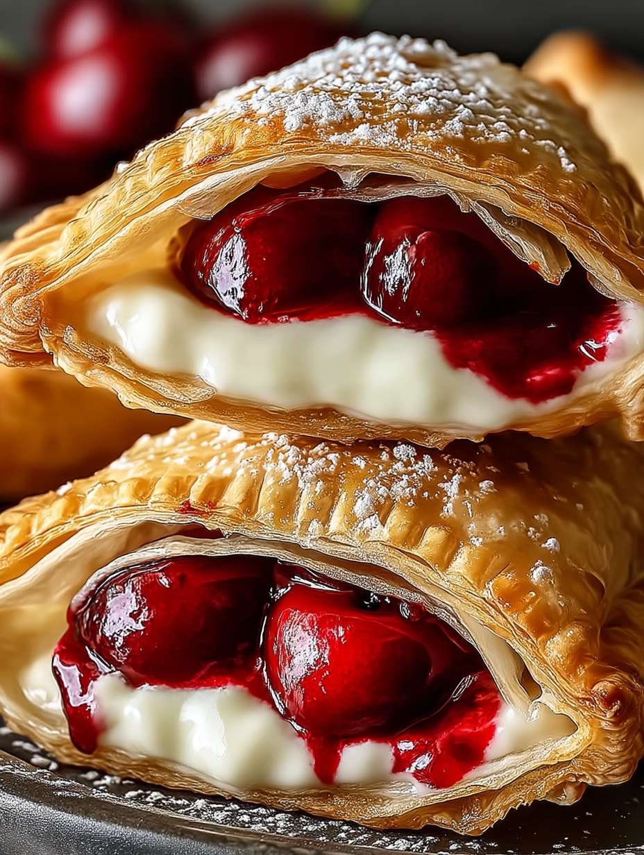 Diese Kirschtaschen mit Frischkäsefüllung sind der perfekte Genuss für jede Gelegenheit. Sie sind einfach zuzubereiten, sodass auch unerfahrene Hobbyköche keine Schwierigkeiten haben werden. Das einzigartige Geschmacksprofil, das die Süße der Kirschen mit der Cremigkeit des Frischkäses kombiniert, wird Ihre Geschmacksknospen verzaubern. Optisch sind sie ein echter Hingucker – goldene Taschen gefüllt mit leuchtend roten Kirschen, die einfach zum Anbeißen aussehen! Darüber hinaus können Sie das Rezept nach Belieben anpassen, indem Sie verschiedene Früchte oder Füllungen verwenden – Ihrer Kreativität sind keine Grenzen gesetzt!