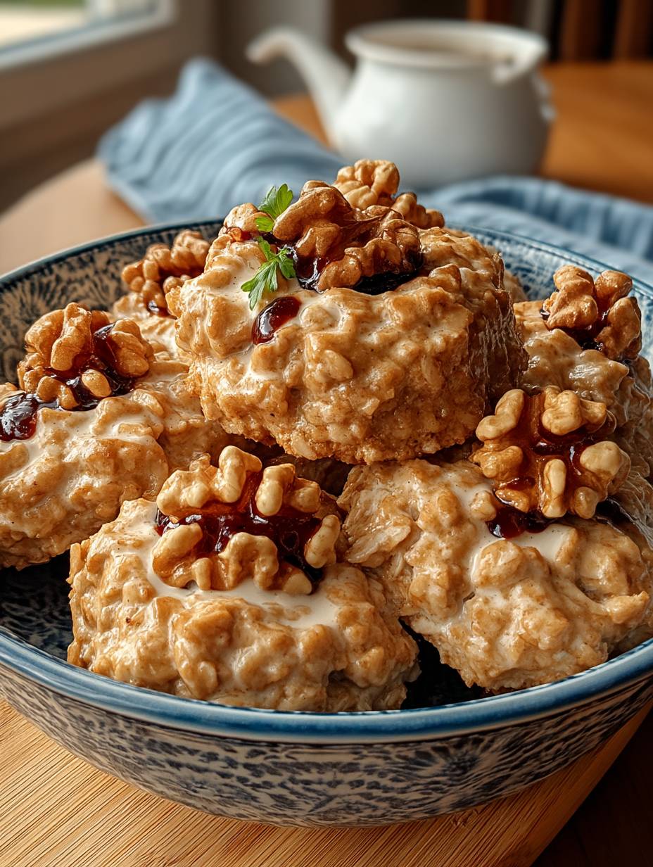 Das Aroma von frisch gebackenen Keksen durchzieht die Küche und weckt Erinnerungen an gemütliche Nachmittage mit Freunden. Die knusprigen Haferflocken-Walnuss-Taler, golden gebacken und verführerisch duftend, sind einfach unwiderstehlich und lassen das Wasser im Mund zusammenlaufen.