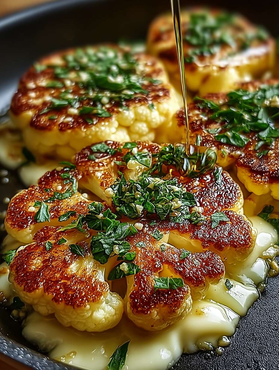 Nehmen Sie die Steaks vorsichtig aus der Pfanne und garnieren Sie sie mit frischer Petersilie. Servieren Sie sie sofort heiß, um die köstliche Kombination aus knusprigem Blumenkohl und geschmolzenem Käse optimal zu genießen.
