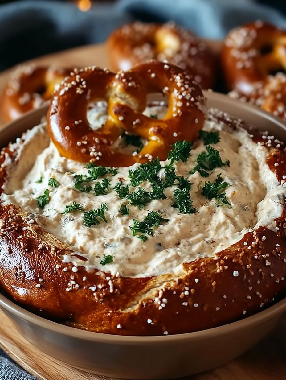 Serviertipp: Den Dip in einer schönen Schüssel anrichten und mit zusätzlichen Kräutern garnieren. Zusammen mit warmen Brezeln servieren – so bleibt die knusprige Textur erhalten!