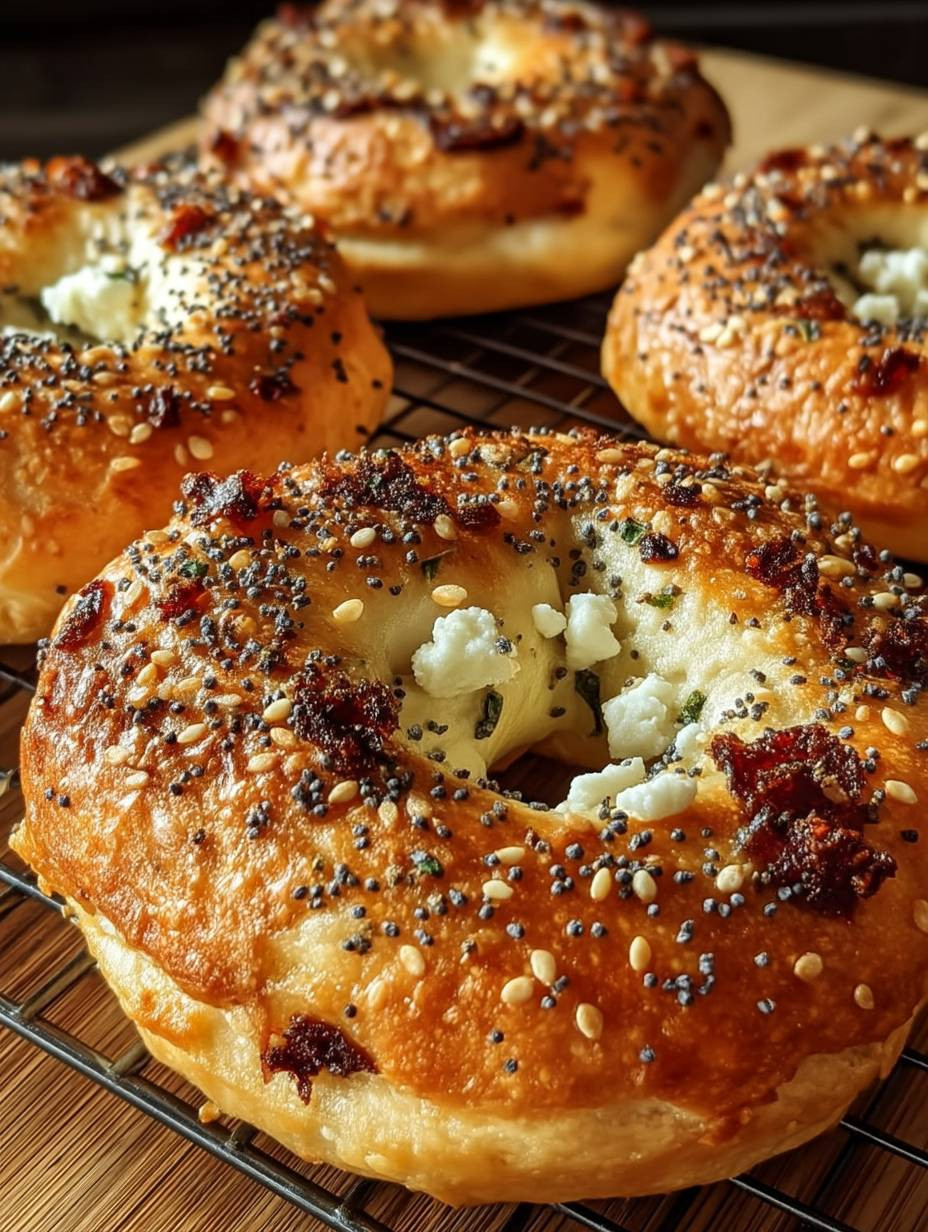 Lassen Sie die Bagels kurz abkühlen und genießen Sie sie warm aus dem Ofen! Garnieren Sie nach Belieben mit Ihrem Lieblingsaufstrich oder frischem Gemüse.