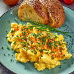 Sobald das Rührei den gewünschten Gargrad erreicht hat – schön fluffig und dennoch cremig – nehmen Sie es vom Herd. Garnieren Sie es mit frischen Kräutern und servieren Sie es sofort! Ein weiteres Plus? Dieses Gericht passt hervorragend zu Toast oder frischem Brot!