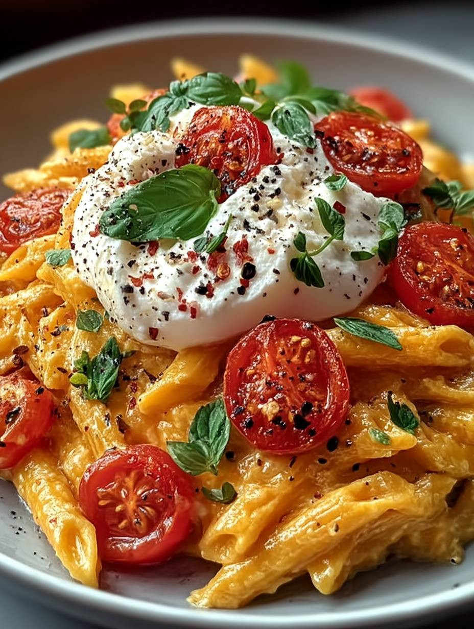 Leckeres burrata-tomaten-pasta Rezept mit detaillierten Anweisungen und Nährwertangaben.