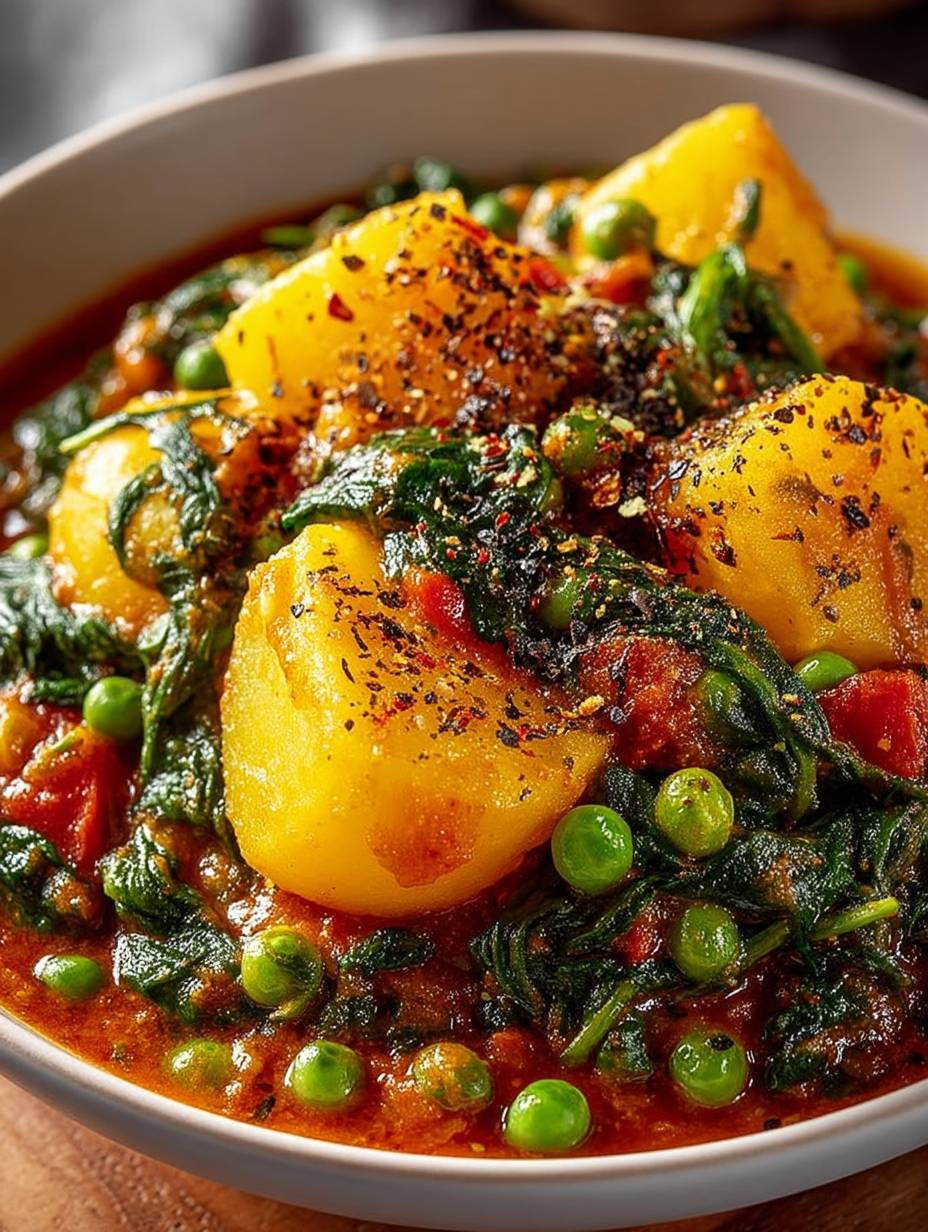 Leckeres veganes kartoffelcurry spinat erbsen Rezept mit detaillierten Anweisungen und Nährwertangaben.