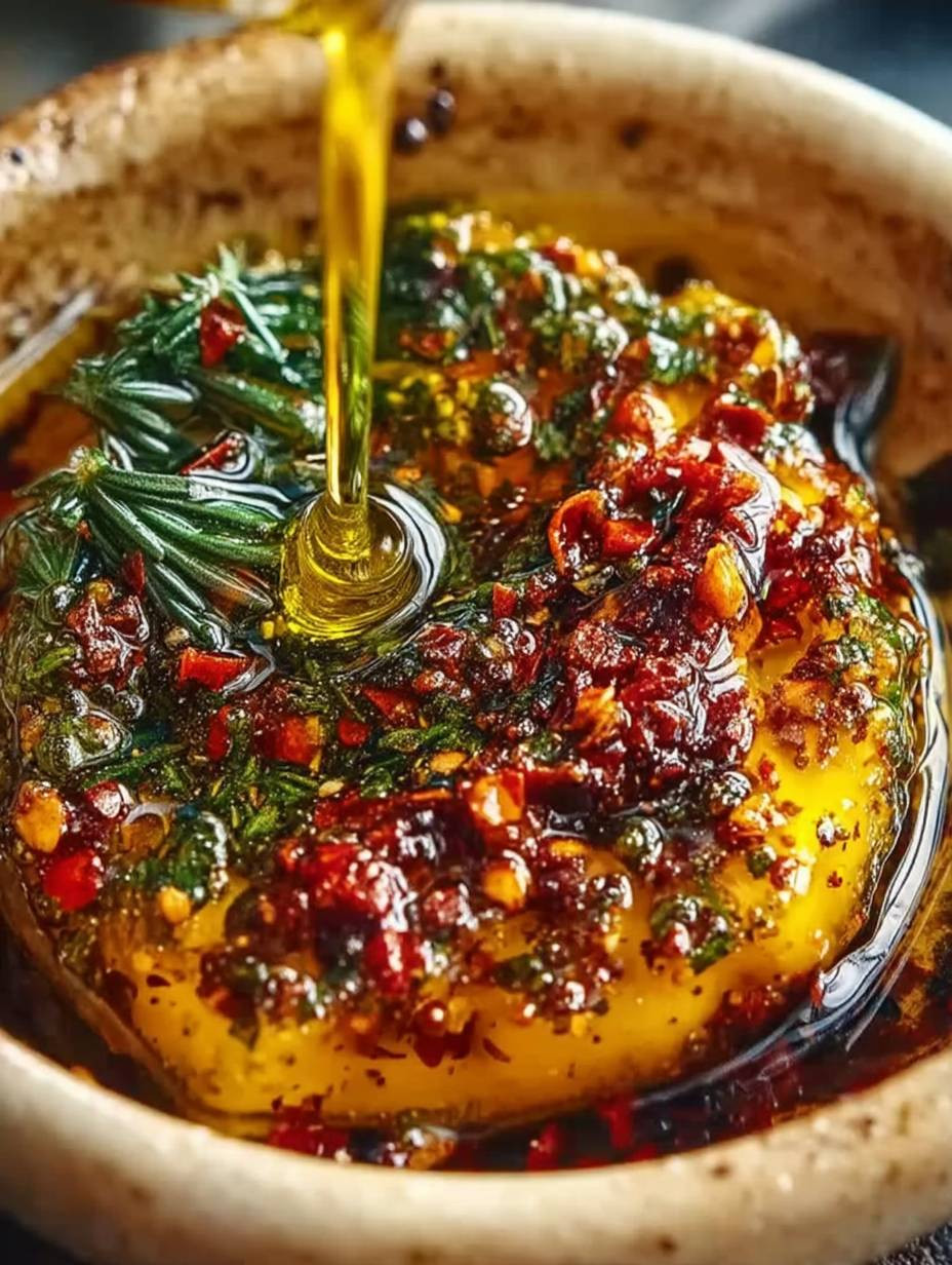 Dieses Mediterrane Olivenöl-Dip ist nicht nur einfach zuzubereiten, sondern auch ein wahres Geschmacksfeuerwerk! Mit seiner leichten Knoblauchnote und der Frische der Kräuter wird es Ihre Geschmacksknospen zum Tanzen bringen. Die ansprechende goldene Farbe macht es zu einem Hingucker auf jedem Tisch. Egal, ob Sie es als Vorspeise oder als Beilage servieren – dieses Dip passt zu allem und lässt sich wunderbar anpassen. Fügen Sie nach Belieben weitere Kräuter oder Gewürze hinzu und lassen Sie Ihrer Kreativität freien Lauf!