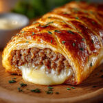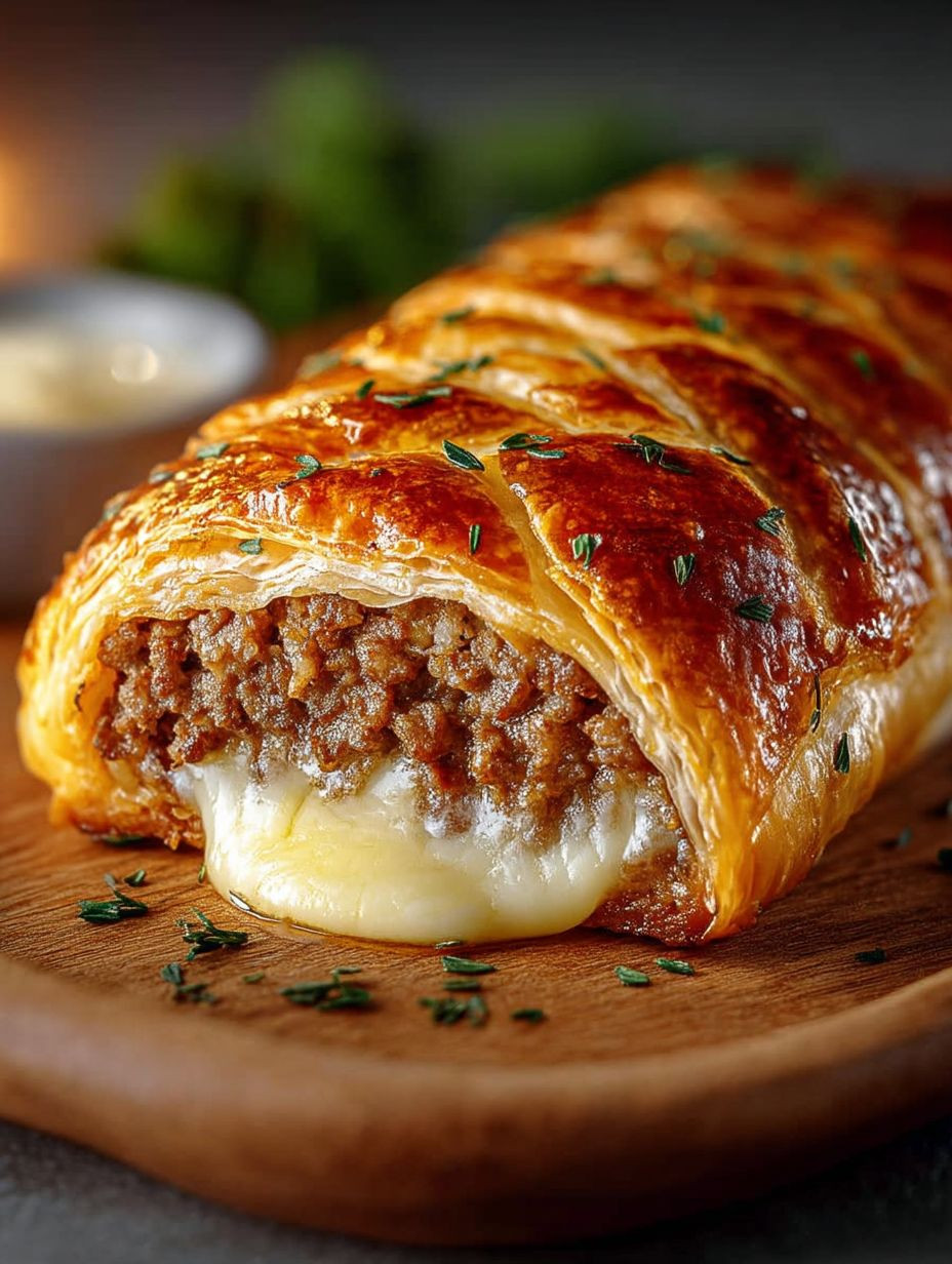 Es gibt nichts Besseres, als in eine goldbraun gebackene Blätterteigrolle zu beißen, die mit herzhaftem Hackfleisch und geschmolzenem Käse gefüllt ist. Die Kombination aus knuspriger Hülle und saftiger Füllung wird Ihre Geschmacksknospen zum Tanzen bringen – ein echter Hochgenuss für die Sinne!