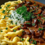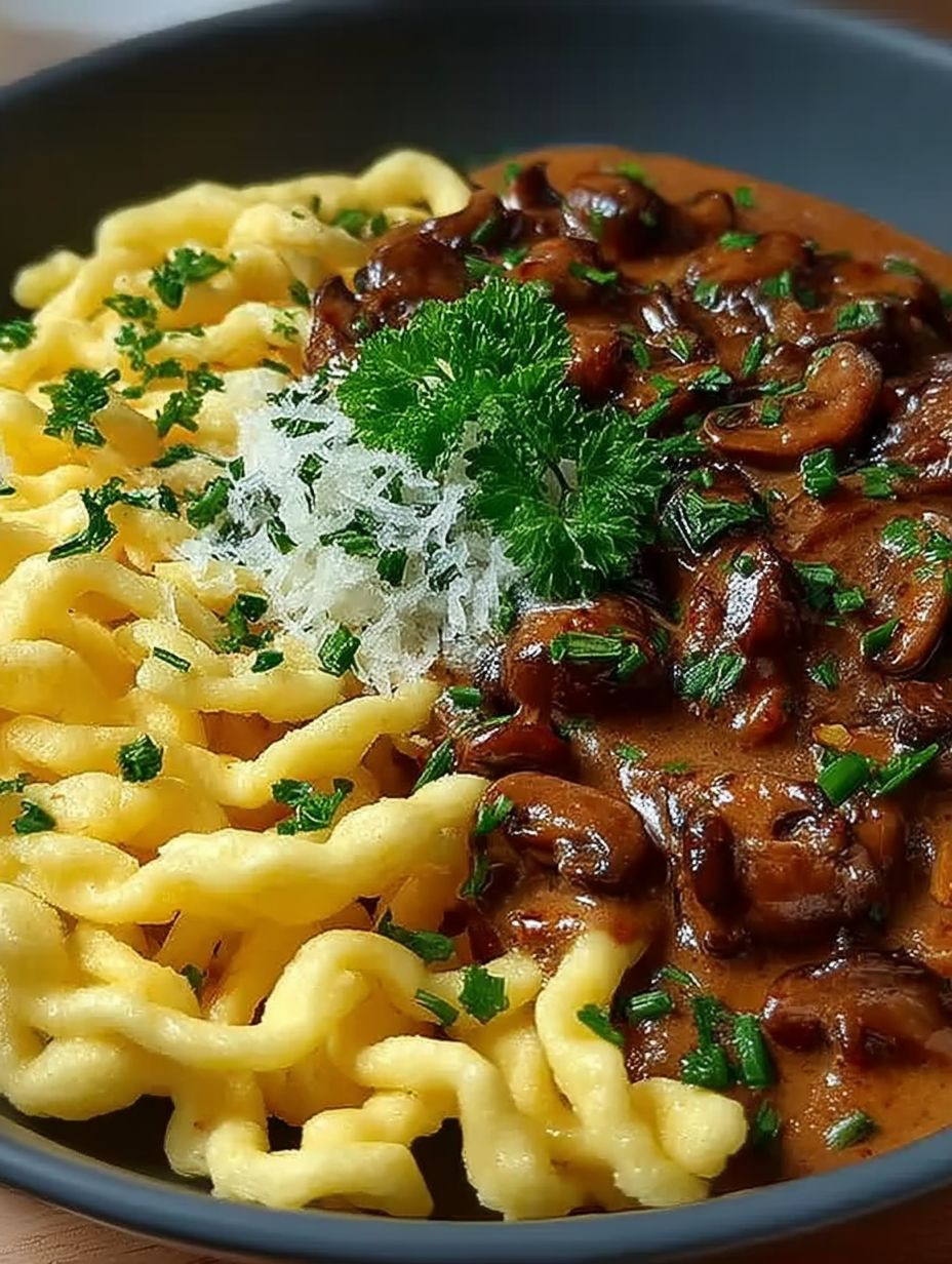 Serviere die Soße über frisch zubereiteten Spätzle für ein perfektes Gericht.