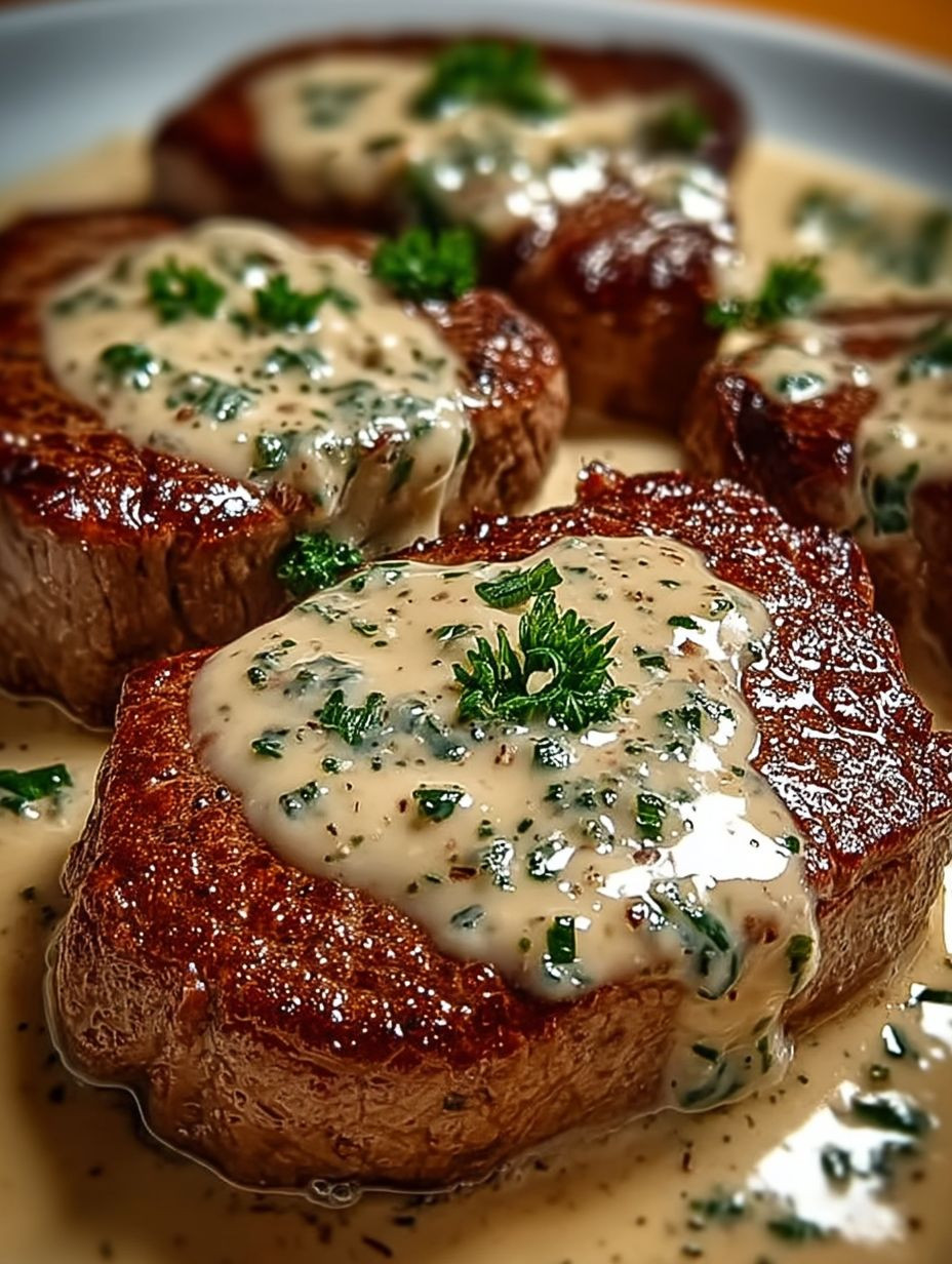 Serviertipp: Diese köstliche Knoblauchsoße perfekt zu Steak eignet sich hervorragend als Dip für Gemüse oder als Begleitung zu gegrilltem Fleisch. Garnieren Sie sie mit einer zusätzlichen Prise Petersilie und genießen Sie sofort die Kombination aus den saftigen Steaks und der aromatischen Soße!