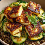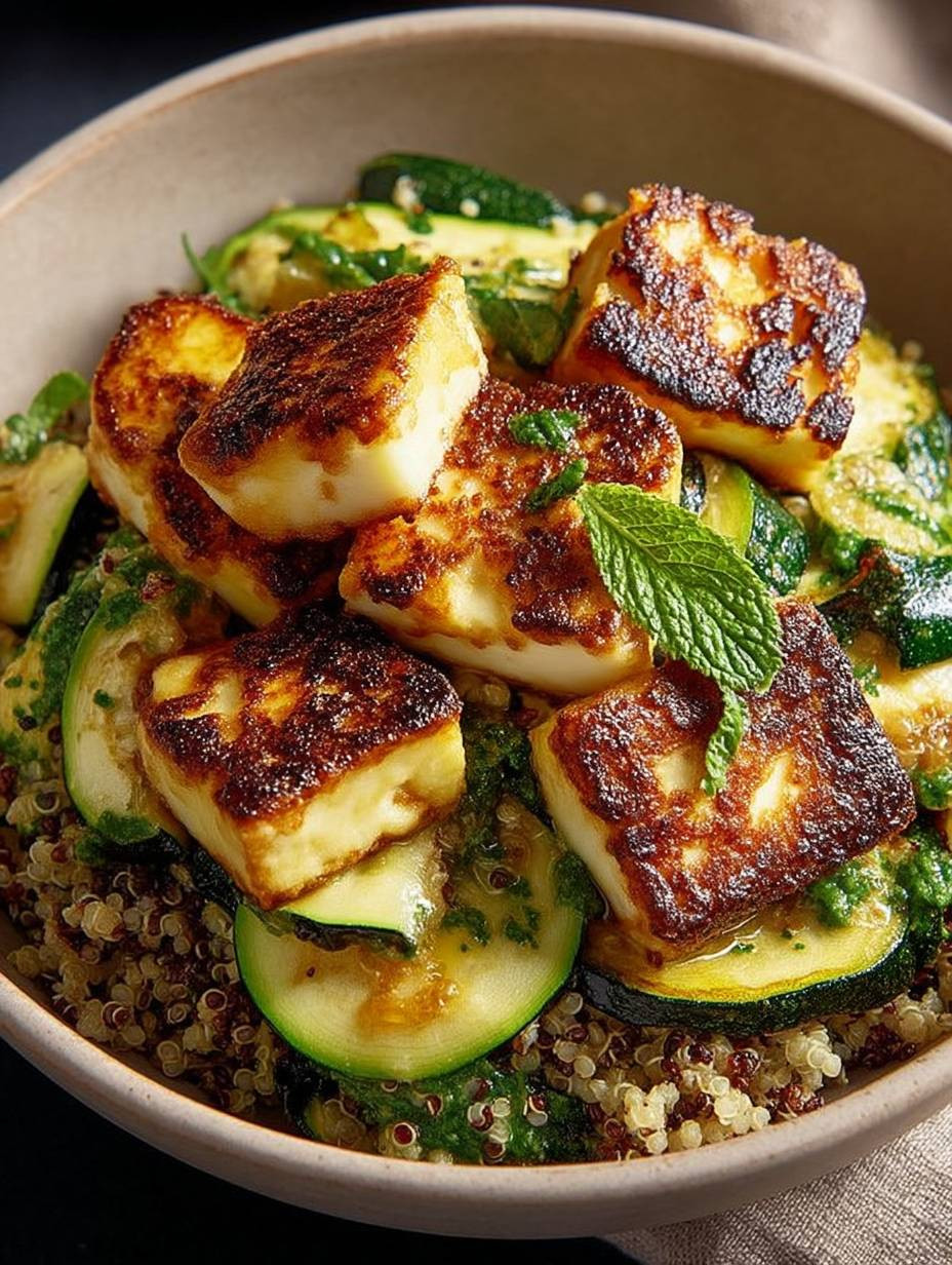 Diese Halloumi-Quinoa-Bowl mit gebratener Zucchini wird Sie sofort begeistern! Die Zubereitung ist kinderleicht – selbst Kochanfänger werden hier schnell zum Küchenprofi. Das einzigartige Geschmacksprofil aus dem würzigen Halloumi und der sanften Süße der Zucchini sorgt für einen Gaumenschmaus. Hinzu kommt die atemberaubende Optik: leuchtendes Grün, goldene Röstnoten und farbenfrohe Kräuter machen jedes Gericht zu einem Hingucker. Und schließlich ist dieses Rezept so vielseitig! Variieren Sie die Zutaten nach Lust und Laune oder fügen Sie Ihr Lieblingsgemüse hinzu – Ihrer Kreativität sind keine Grenzen gesetzt.