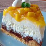 17. Creme gleichmäßig auf dem Biskuitboden verteilen und mindestens zwei Stunden im Kühlschrank fest werden lassen.