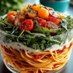 Die Sonne strahlt, die Aromen von frischem Basilikum und reifen Tomaten durchdringen die Luft, während ein köstlicher Italienischer Spaghetti-Schichtsalat auf dem Tisch bereitsteht. Man kann förmlich das Knistern der Pasta hören, während sie sanft in einer bunten Schicht aus knackigem Gemüse und cremigem Dressing eingebettet ist. Ein Fest für die Sinne, das sowohl das Auge als auch den Gaumen erfreut!