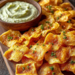 Serviere die warmen Chips zusammen mit dem cremigen Dip auf einer schönen Platte. Garniere eventuell mit einigen frischen Kräutern für einen zusätzlichen Farbtupfer.