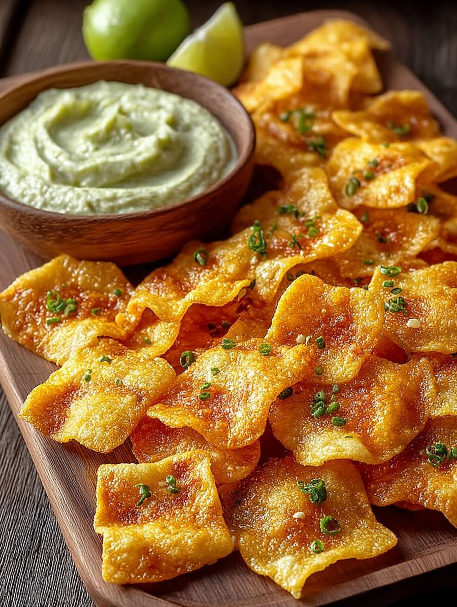 11. Die warmen Chips zusammen mit dem cremigen Dip auf einer schönen Platte servieren.