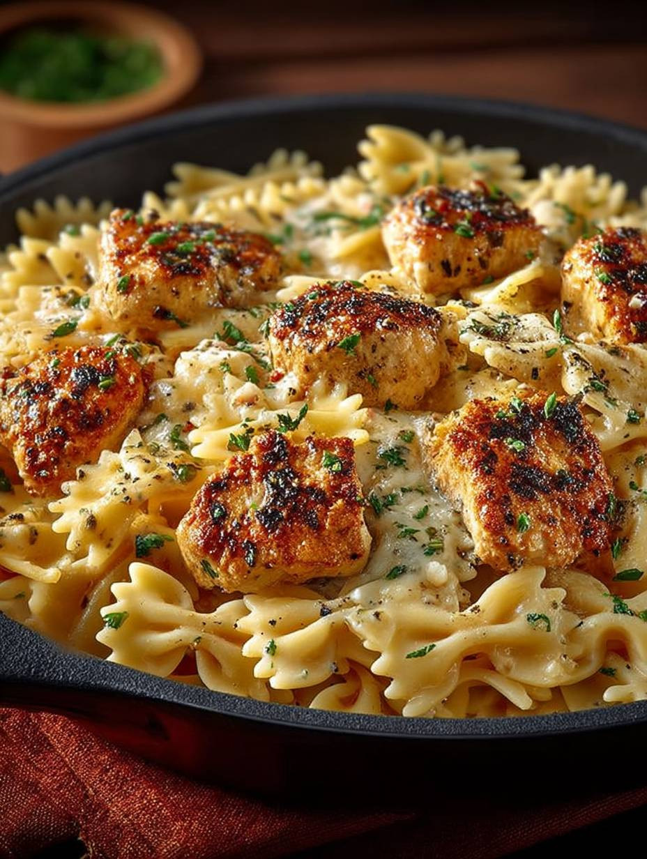 Serviertipp: Mit frisch gehackten Kräutern garnieren und sofort servieren! Genießen Sie den herzhaften Genuss dieser CREMIGEN HÄHNCHEN-FARFALLE-PFANNE mit einem knusprigen Baguette oder einem frischen Salat als Beilage. Guten Appetit!