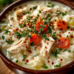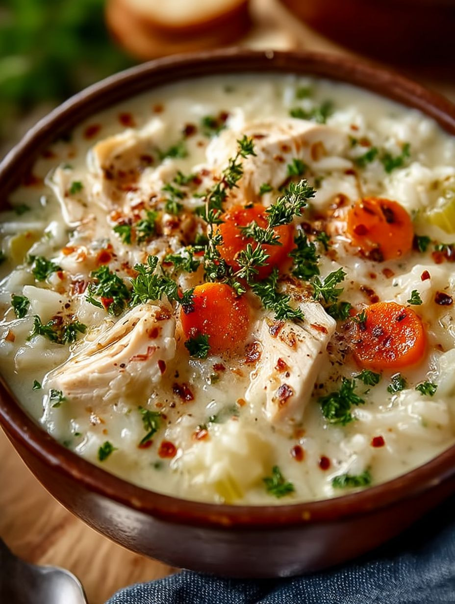 Was dieses Rezept besonders macht: Die cremige Hühner Reis Suppe ist nicht nur einfach zuzubereiten, sondern bietet auch ein einzigartiges Geschmacksprofil dank der Kombination von frischem Gemüse und aromatischen Gewürzen. Ihre atemberaubende Optik wird jeden am Tisch begeistern – die goldene Farbe im Kontrast zu den bunten Gemüsesorten sieht einfach fantastisch aus! Und das Beste? Sie ist vielseitig anpassbar: Fügen Sie Ihre Lieblingsgemüse hinzu oder variieren Sie die Gewürze für Ihr persönliches Geschmackserlebnis.