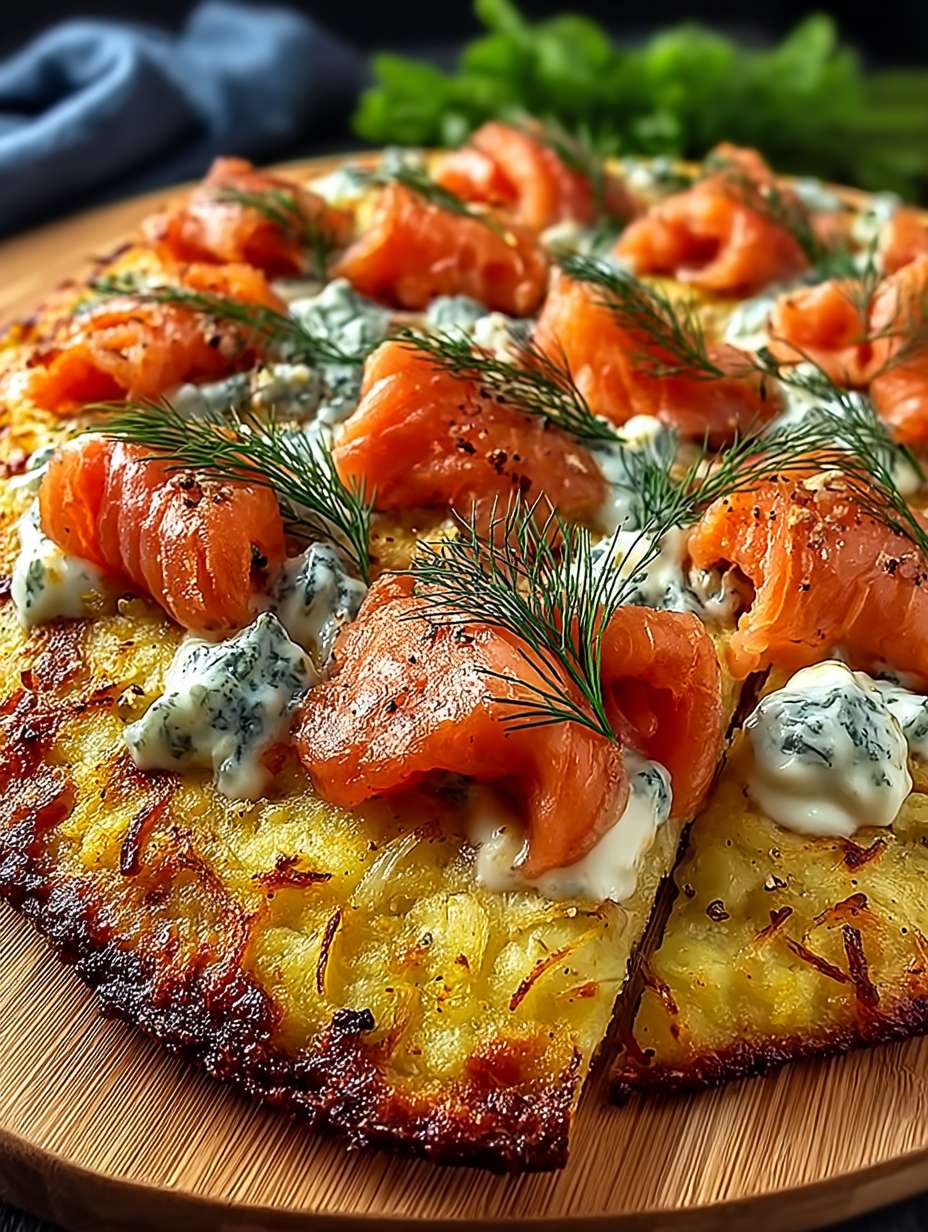 Die Kombination aus knusprigem Kartoffelboden, der mit leuchtend rotem geräuchertem Lachs belegt ist, lässt die Geschmacksknospen tanzen. Das Aroma von frisch gebackenem Teig und zartem Fisch vereint sich zu einem Fest für die Sinne, das selbst den größten Gourmet überzeugt.