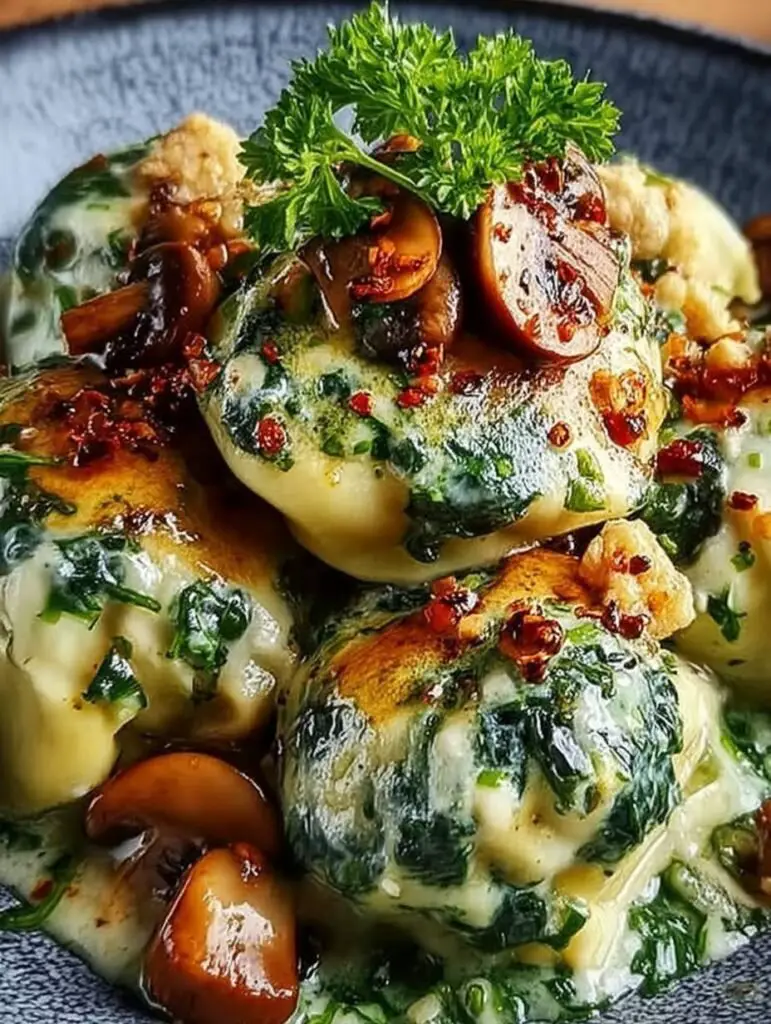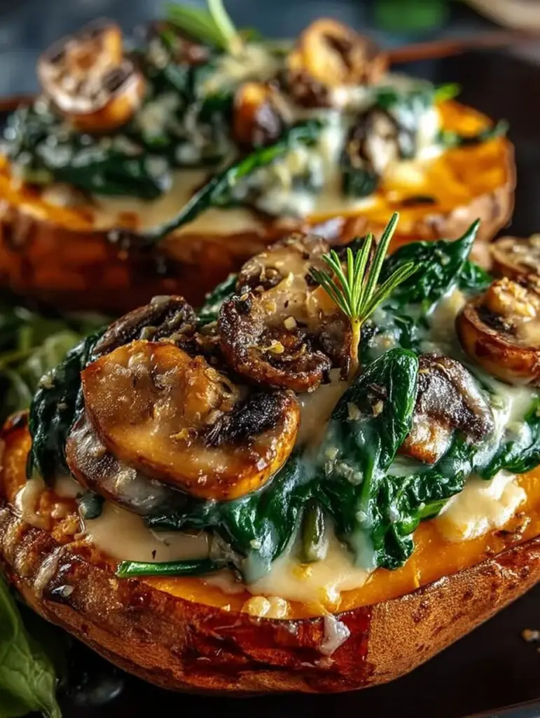 Gefüllte Süßkartoffeln mit Champignons und Spinat