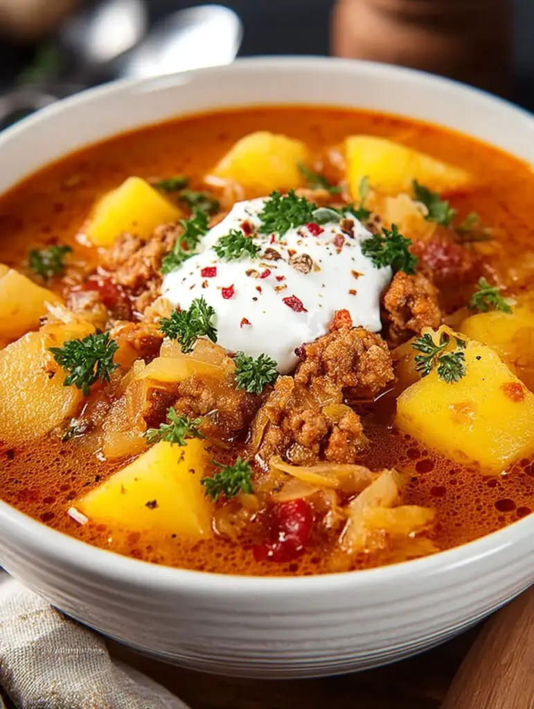 Die Aromen von Omas Sauerkrautsuppe mit Kartoffeln und Hackfleisch steigen einem in die Nase und wecken Erinnerungen an gemütliche Abende am Küchentisch. Die sanfte Säure des Sauerkrauts mischt sich mit …